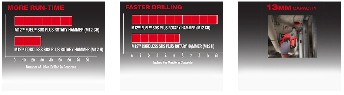 Providing up to 2X more run-time, up to 75% more speed and the largest SDS Plus bit capacity in its class, MILWAUKEE™ has combined their exclusive POWERSTATE™ brushless motor, REDLITHIUM™ battery pack, and REDLINK PLUS™ intelligence to deliver a 12V Rotary Hammer that rivals compact 18V tools on the market today.